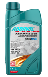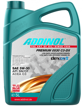 ADDINOL Premium 0530 C3-DX – синтетическое высокомощное моторное масло легкого хода со свойством Longlife. Является новейшей разработкой компании Addinol. Продукт относится к классу SAE 5W-30. Моторное масло рекомендуется для бензиновых двигателей, функционирующих на обычном бензине, E85, природном (CNG) или сжиженном (LPG) газе, а также для дизельных двигателей. Продукт гарантирует оптимальную работу и длительный срок службы новейшей техники с фильтром тонкой очистки (DPF). Рекомендуется также при последующей установке фильтра тонкой очистки.